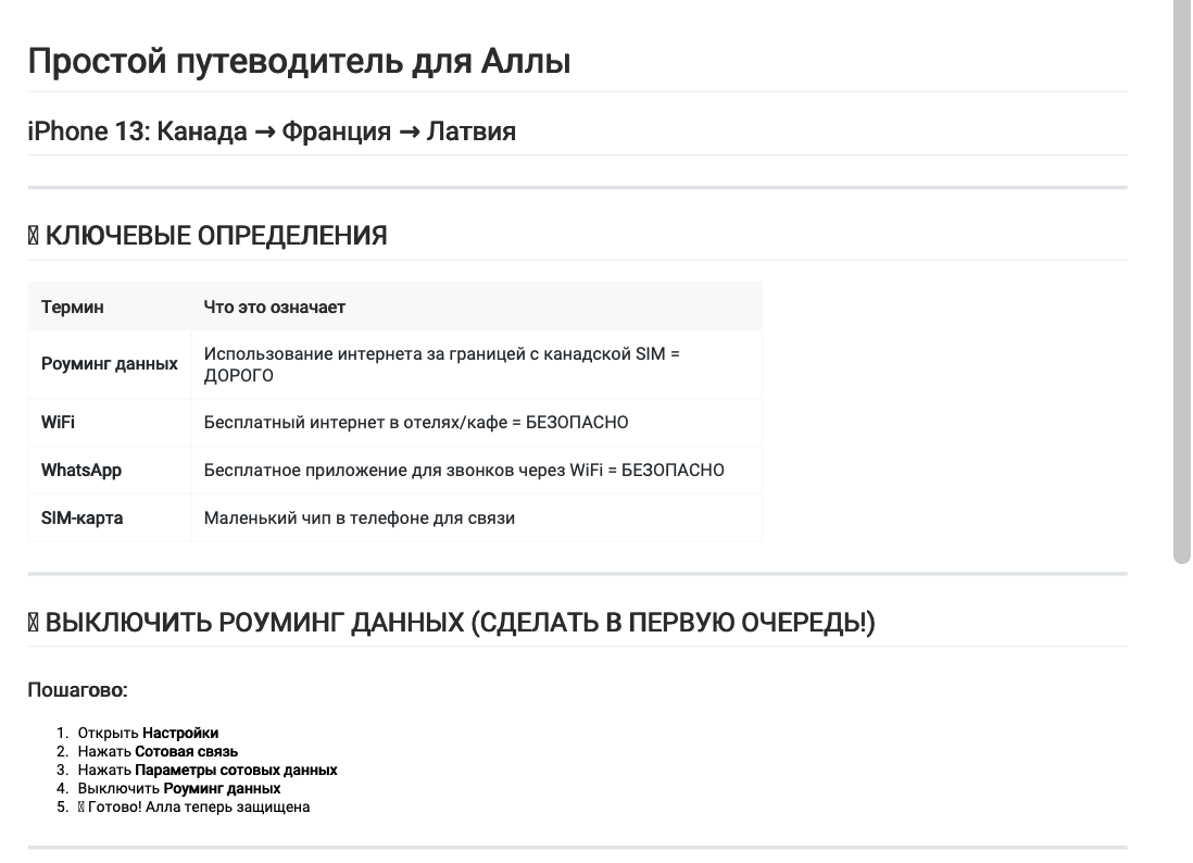 I had Claude write a one-page document in her native tongue (Russian) on how and when to use cellular data the moment she left the house, along with a quick-start guide. I gave Claude her carrier information, her phone brand, and they she had wifi in France, a SIM card in Latvia. I gave Claude her itinerary. It spit out a fantastic guide in Russian.