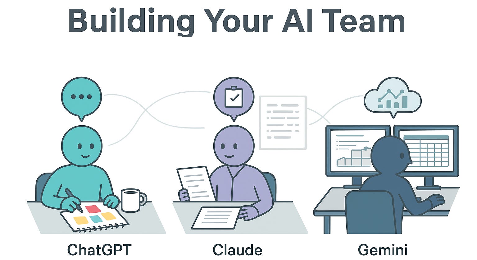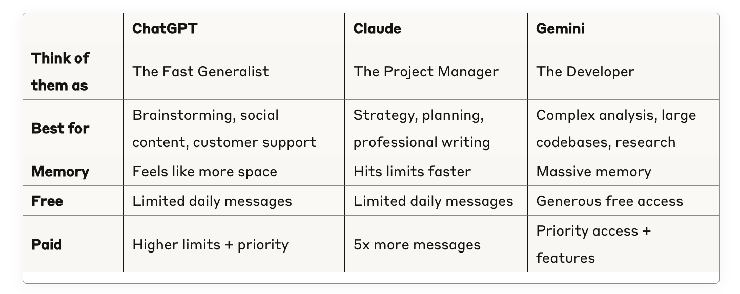 I know AI is not human, but it helps to think of it more like a different colleague on your team – each with its own expertise, personality, and quirks. After countless hours with each system, I now clearly have an archetype to work with in my mind. Here's how you too can start thinking about the big three: